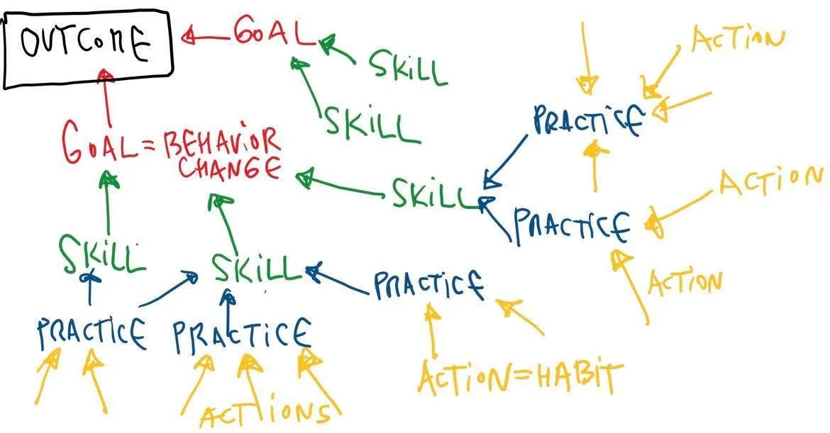 HABIT is a daily ACTION, small, specific, simple, concrete task you do consistently without even giving it a thought – the so called automated behavior (taking a breath and a sip of water between bites). Exercising and applying it creates a PRACTICE (eating slowly and mindfully). Eventually the practices build the ability, competence or give the capacity to develop a SKILL (eating well intuitively). Having the right set of skills will eventually bring you towards your BEHAVIOR GOAL (develop a healthy eating praxis), which bears the highest potential to end-up as a desired OUTCOME (a need, want, feeling) (lose weight). That is why the habit/ action bears such weight and is so powerful - the cornerstone of every behavior goal, and the best option to make it to your OUTCOME goal.
