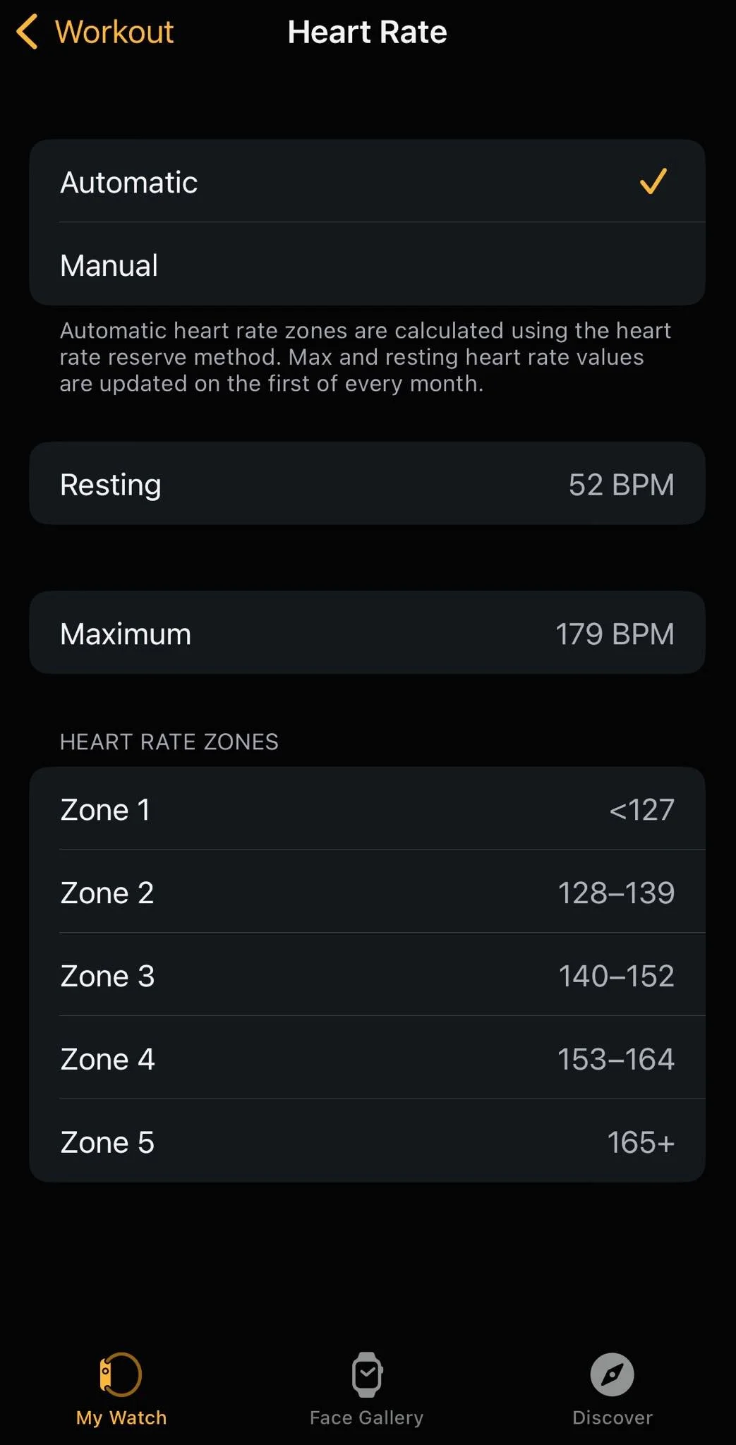 0.7*(HR max — HR at rest) + HR at rest. In my case, 0.7*(183–47)+48 = 142 beats per minute